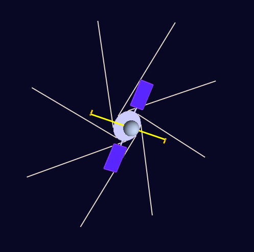 A schematic view of the deployment phase of a spinning electric sail with auxiliary rockets. Only eight wires have been drawn for simplicity. The violet-blue surfaces are solar panels and the yellow lines are propulsive arms (with small rockets attached to the tips) which create the initial spacecraft spin.