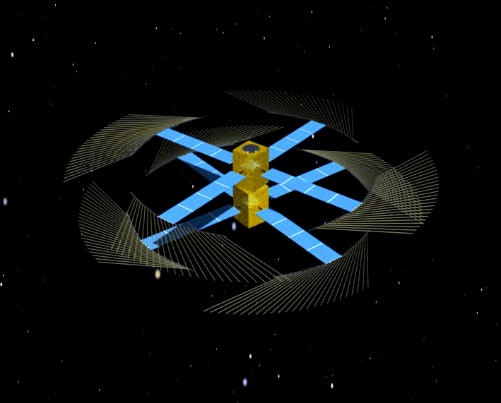 In this phase the wires have been deployed and the electron gun has been started. The blue lines symbolise the electron beam of the gun. The spinup propulsion arms and associated fuel tank have been jettisoned to save mass. The solar wind acts on the wires, bending them slightly. The electric field around the wires is depicted by dashed red line.